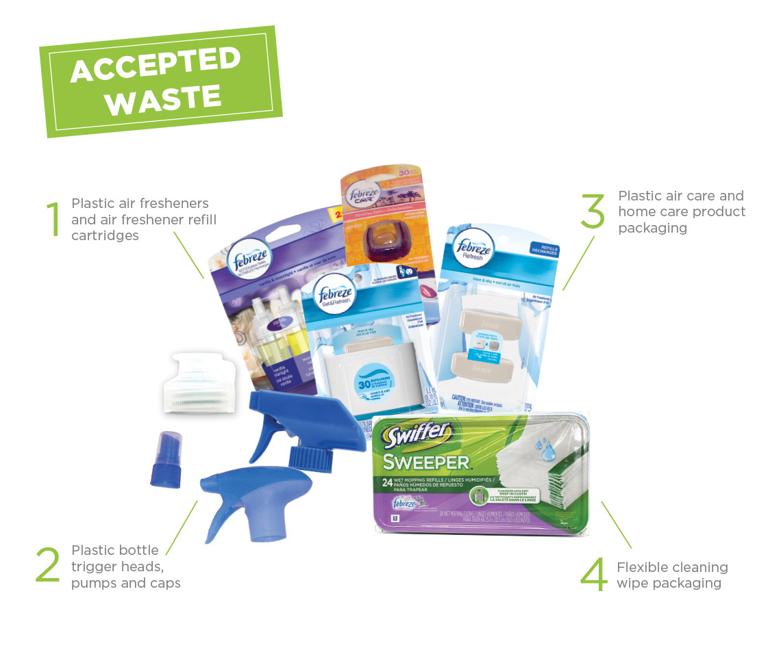 Program accepted waste: Plastic air fresheners and air freshener refll cartridges, plastic bottle trigger heads, pumps and caps, plastic air and home care product packaging, flexible cleaning wipe packaging.